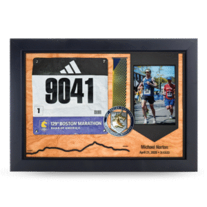 Our Boston displays turn your hard-earned bib, chip time, and photo into a keepsake worthy of the moment. Handcrafted from premium birch plywood, these inserts are designed to preserve the details that made race day unforgettable.