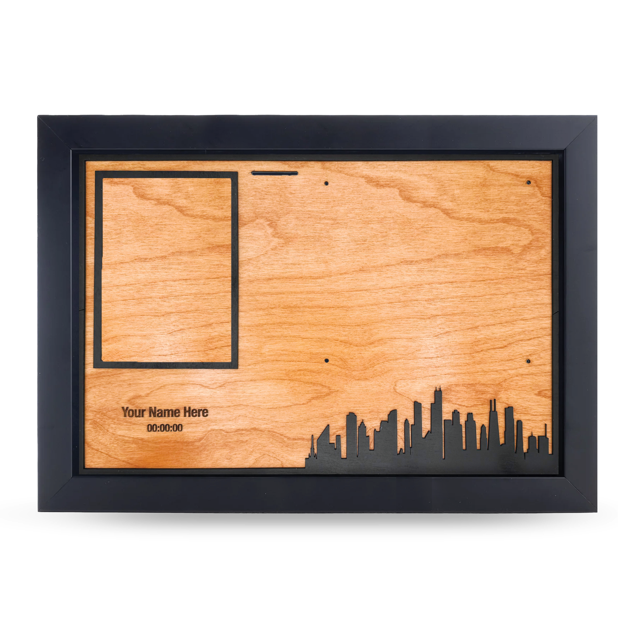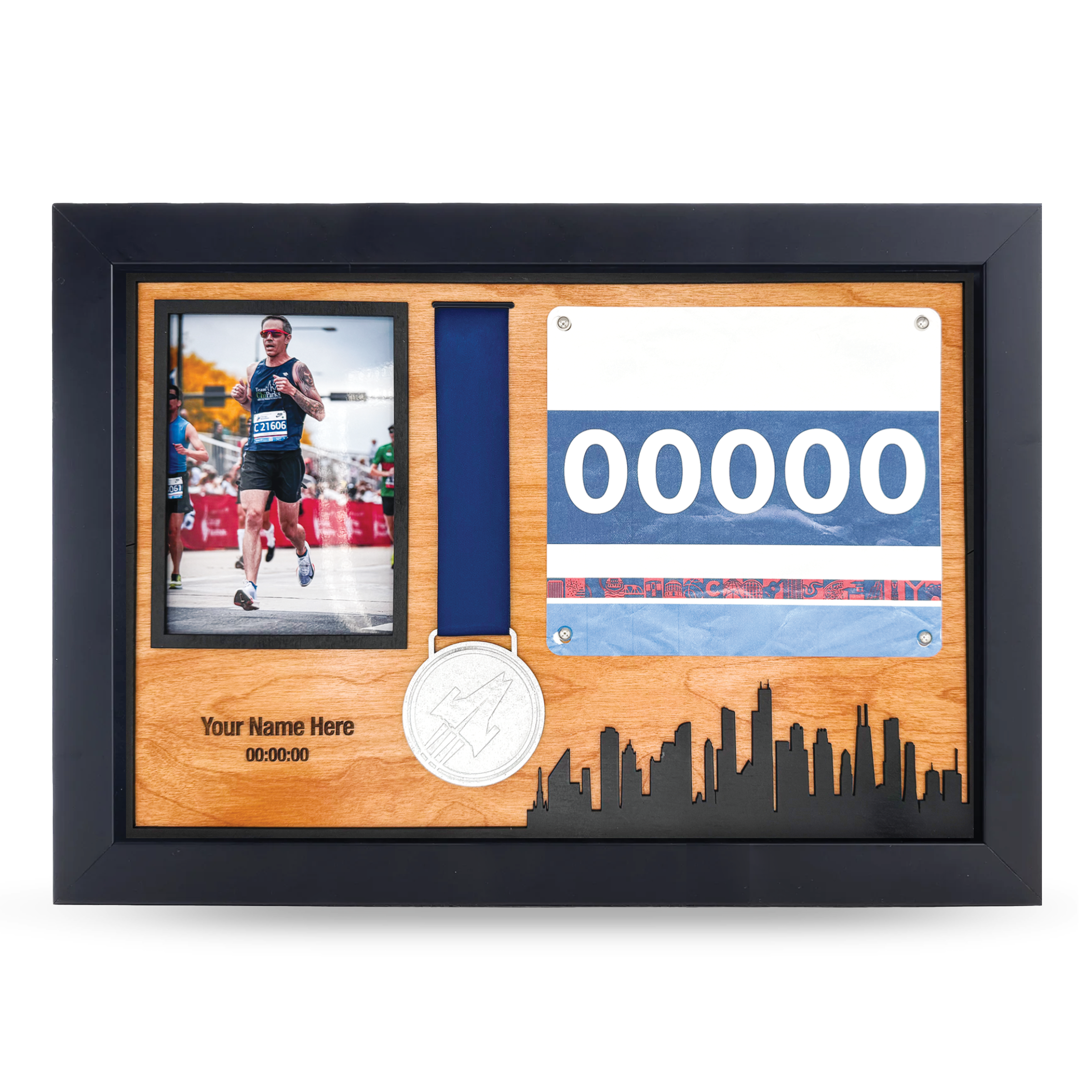 • A dedicated space to mount a photo from race day—whether it’s your finish line moment, a mid-race memory, or a snapshot with loved ones
