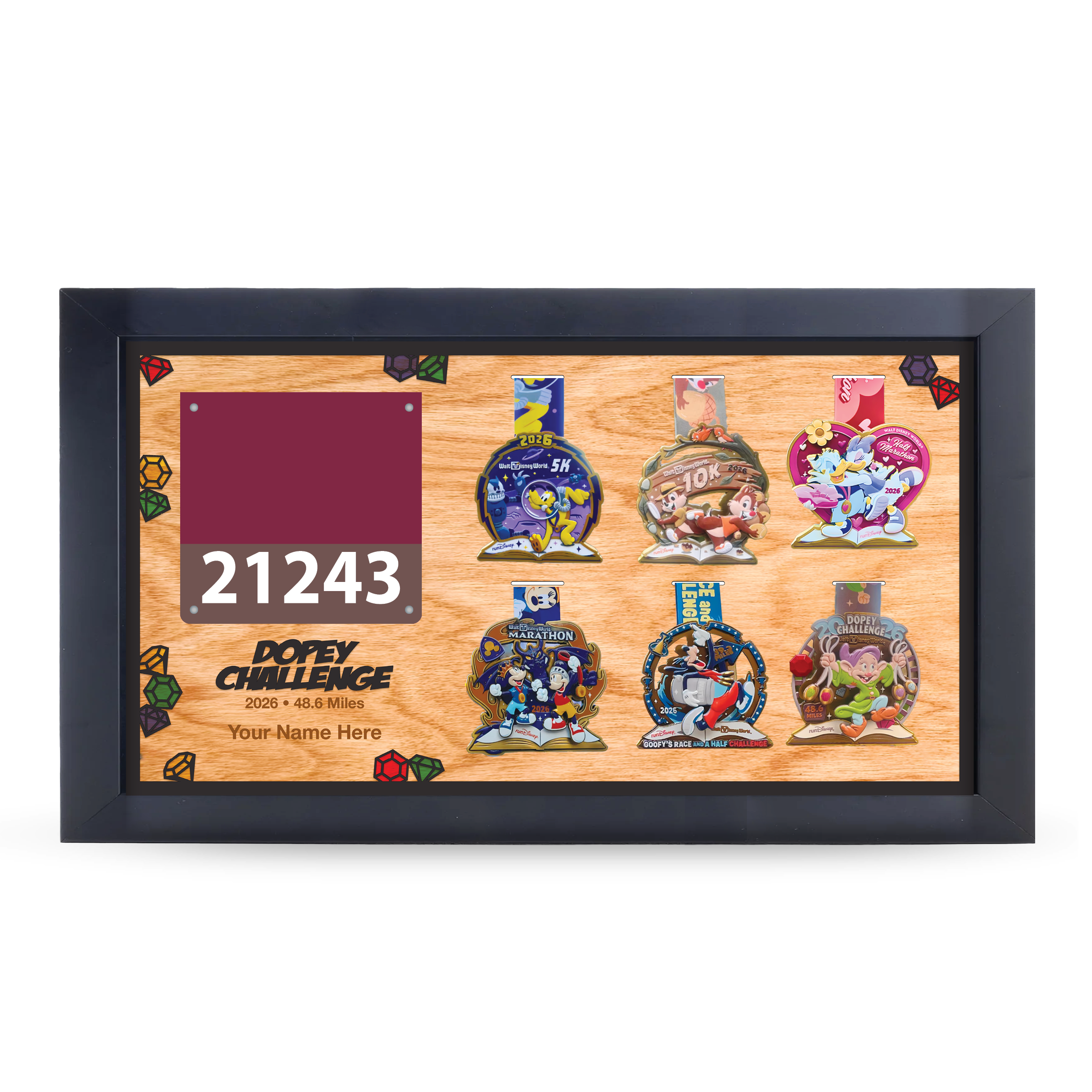Created for runners who embraced the ultimate endurance test, this Dopey Challenge medal display honors the remarkable feat of completing 48.6 miles across race weekend. Designed to showcase all your challenge medals together, this display is a bold tribute to dedication, resilience, and one of the most unforgettable accomplishments in running.
