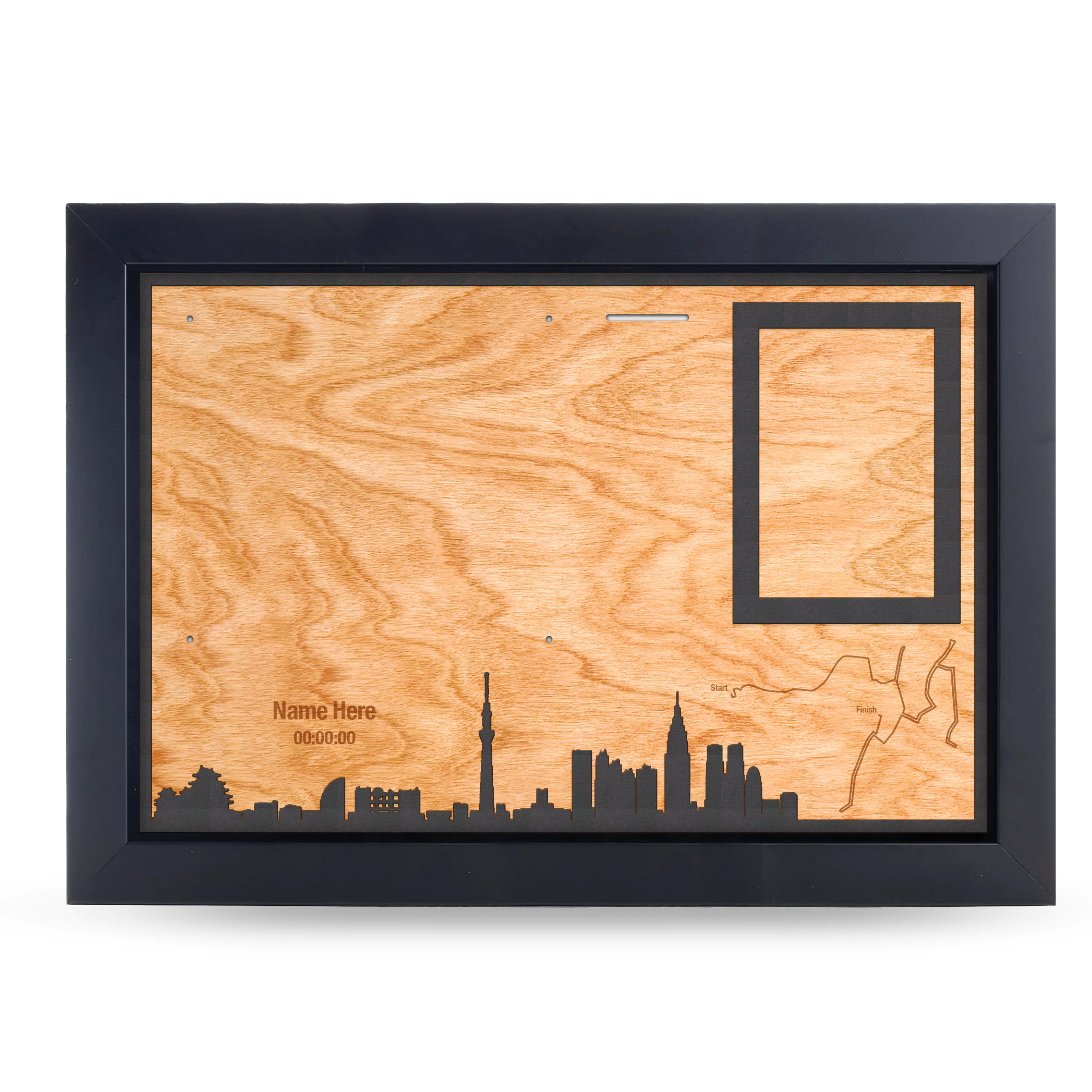 Commemorate your race in Tokyo with a framed display designed to showcase your medal, bib, and a favorite race-day photo. A layered Tokyo skyline paired with an engraved course map adds depth and detail, creating a meaningful way to preserve your finish.