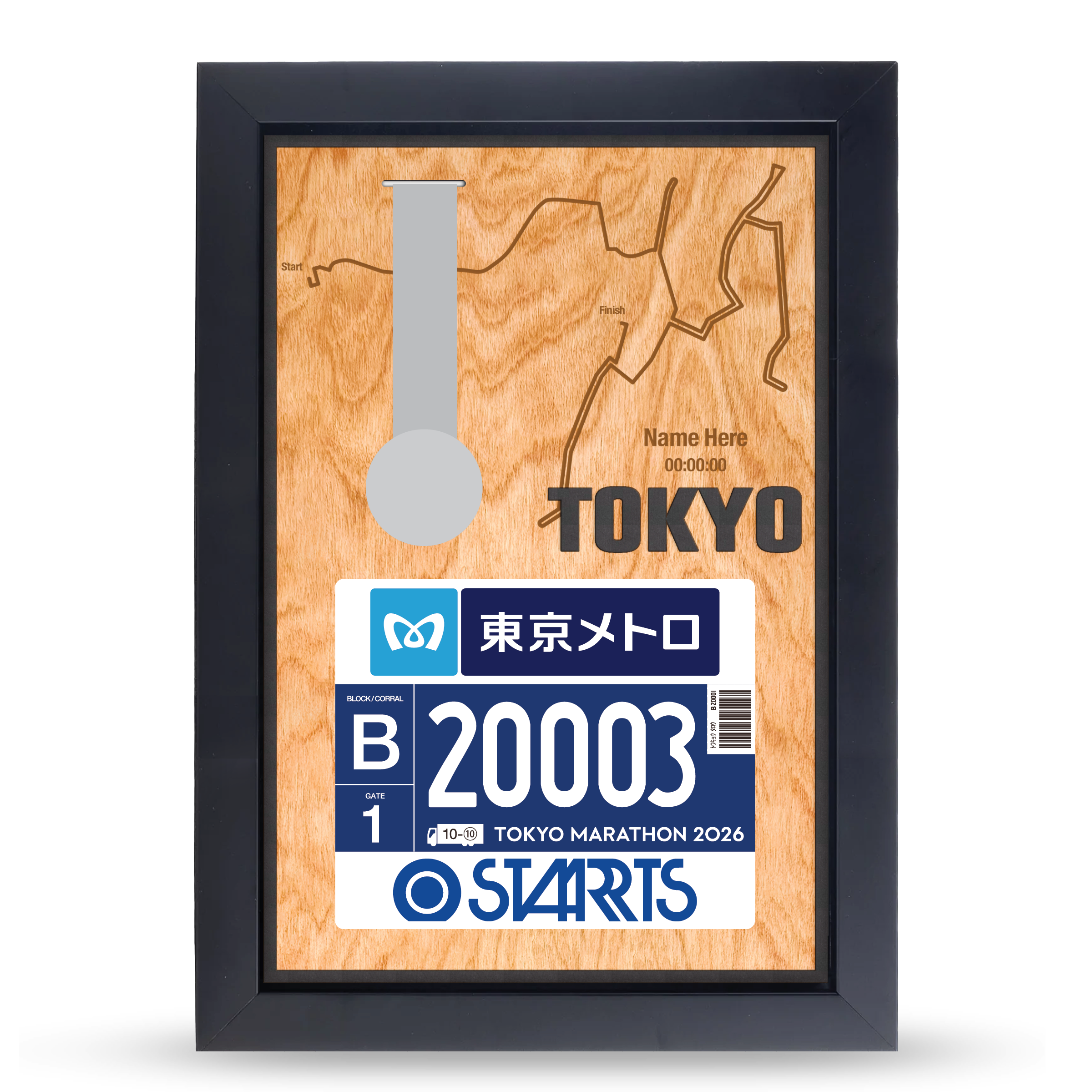 Celebrate your 26.2 mile finish in Tokyo with a framed medal display featuring a detailed course map and space to showcase your race bib. Personalized with your name and finish time, this piece turns your race-day accomplishment into a lasting keepsake.